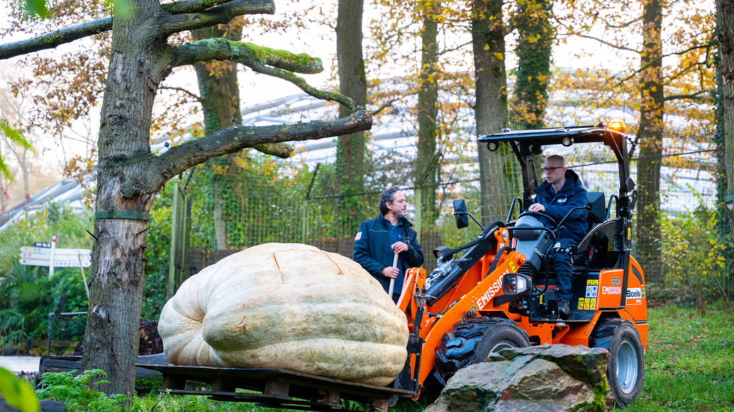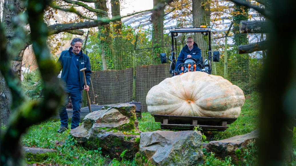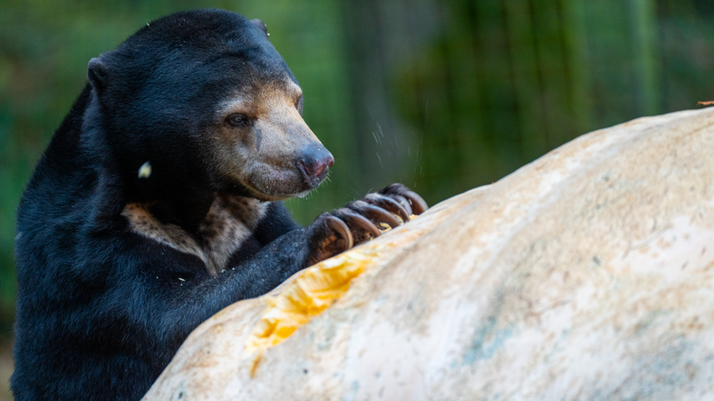 Donderdag 14 november om 08.30 uur stuiten de drie Maleise beren van Koninklijke Burgers’ Zoo op een enorm eetbaar gevaarte in hun buitenverblijf. Met hun sterke klauwen, lange nagels en behendige tong breken de alleseters Nederlands grootste witte reuzenpompoen met een gewicht van 791 kilo open om zich vervolgens tegoed te doen aan het vruchtvlees.