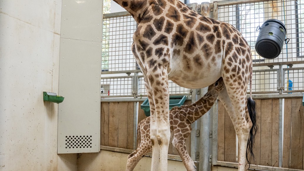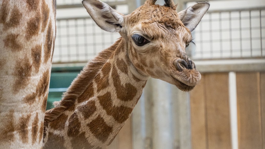 Giraffe geboren op dinsdag 21 oktober 2025 omstreeks 23.00 uur is vanaf vandaag voor het eerst zichtbaar voor bezoekers Arnhems dierenpark.
